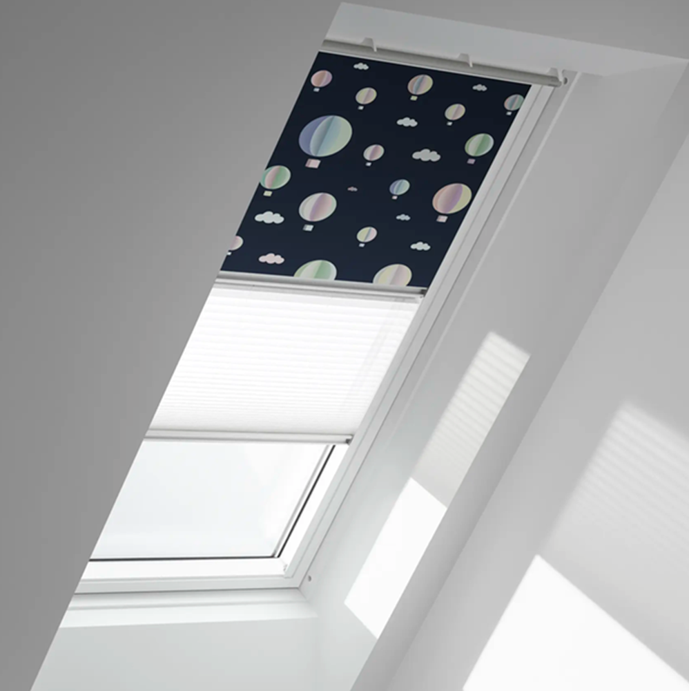VELUX® DFD Duo blackout roller blinds is a blackout roller and a translucent pleated blind in one. The blind offers the best of both worlds with two ways to control the light in one solution - blackout the room or soften the incoming light.