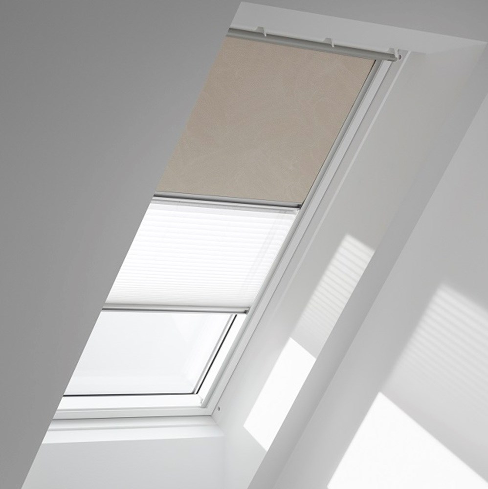 VELUX® DFD Duo blackout roller blinds is a blackout roller and a translucent pleated blind in one. The blind offers the best of both worlds with two ways to control the light in one solution - blackout the room or soften the incoming light.