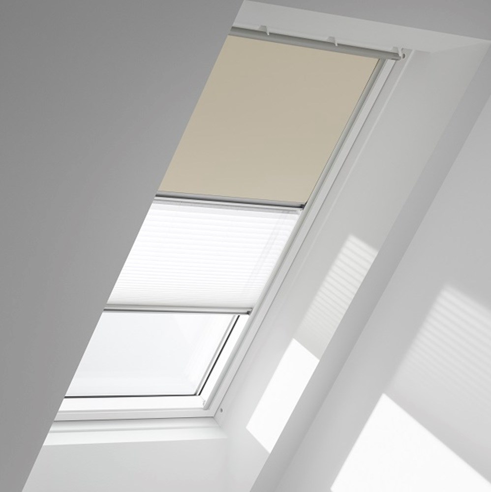 VELUX® DFD Duo blackout roller blinds is a blackout roller and a translucent pleated blind in one. The blind offers the best of both worlds with two ways to control the light in one solution - blackout the room or soften the incoming light.